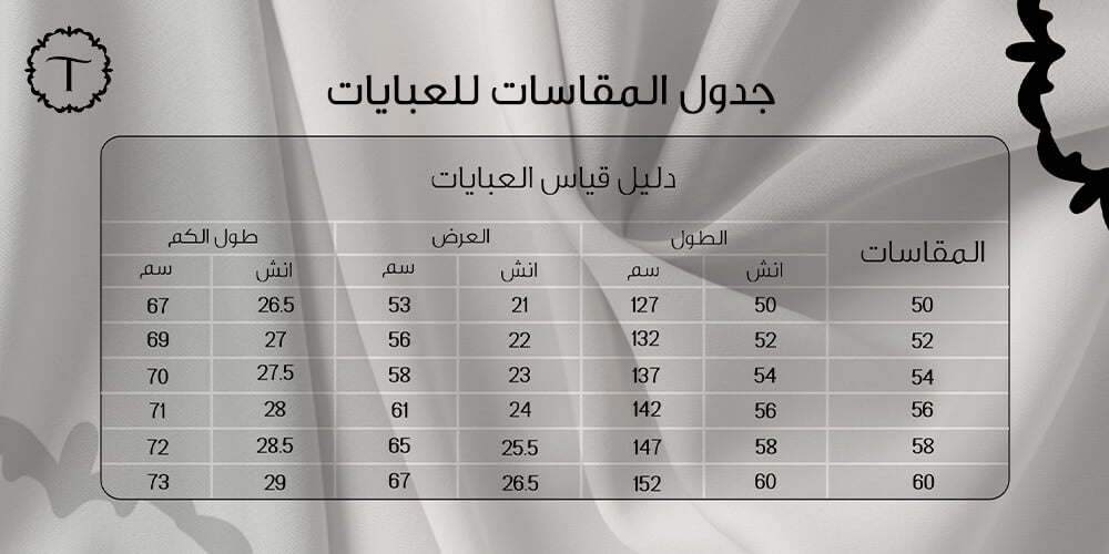 يقدم متجر عبايات تايفيت جدول مقاسات دقيق يساعدكِ في اختيار العباية المناسبة لجسمك بكل سهولة.
